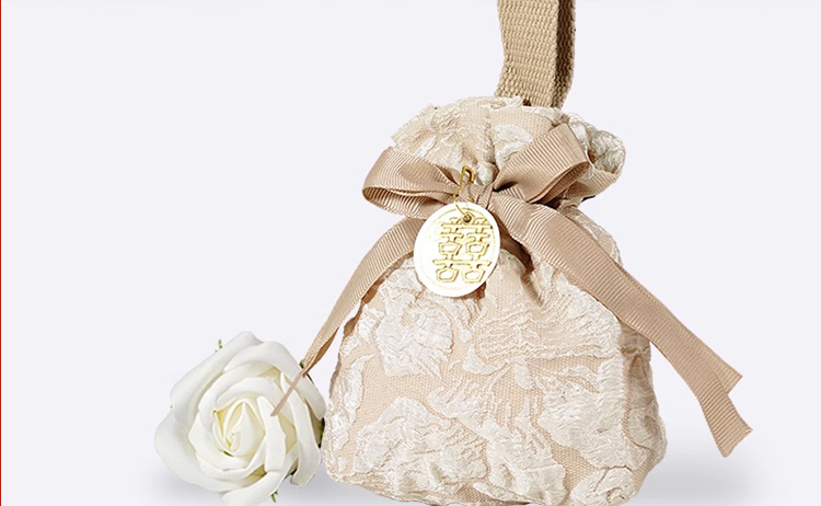 材质特质褶皱棉布+棉麻手提 + 丝质抽绳 + 精致挂饰 颜色玫瑰红/蔷薇粉/杏仁黄 尺寸13.5cm*11cm*6cm 工艺精美丝印 用途结婚/订婚/领证/纪念,馈赠亲朋好友,一起分享喜悦